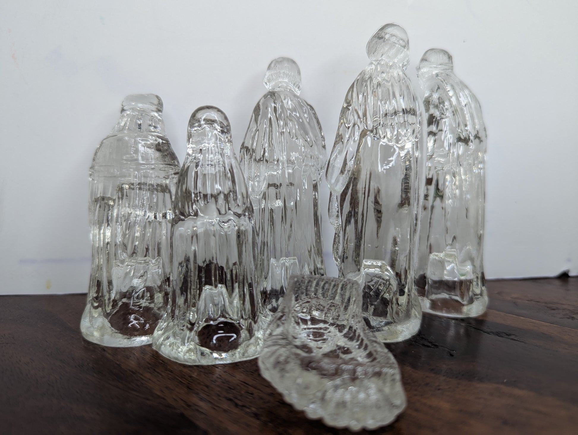 Mark: Set/7 Glass Nativity W/Mirror Item No. 7321 1988 CBK Ltd Union City TN. Small glass nativity that displays on a small round mirror. IOB. No chips or cracks. Used in excellent condition, the box shows wear. Shipping will be different than at check-out due to standard size box being too large for this item. Please see our shipping policies.
