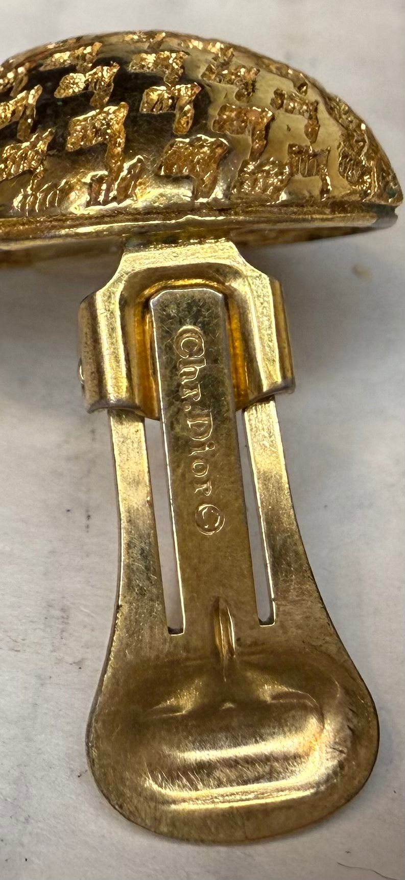 Mark: ChrDior. 1st pair: Dior earrings are large round, gold toned clip-on earrings in a weave design. CD pair is missing one pad (see pictures). 2nd pair: Large round gold toned clip-on earrings. Diagonal lines have a copper look in lines. Some wear (see pictures). Some wear on both sets. Used in good condition. Price is for both sets. Shipping may be different than at check-out. Please see our shipping policies.