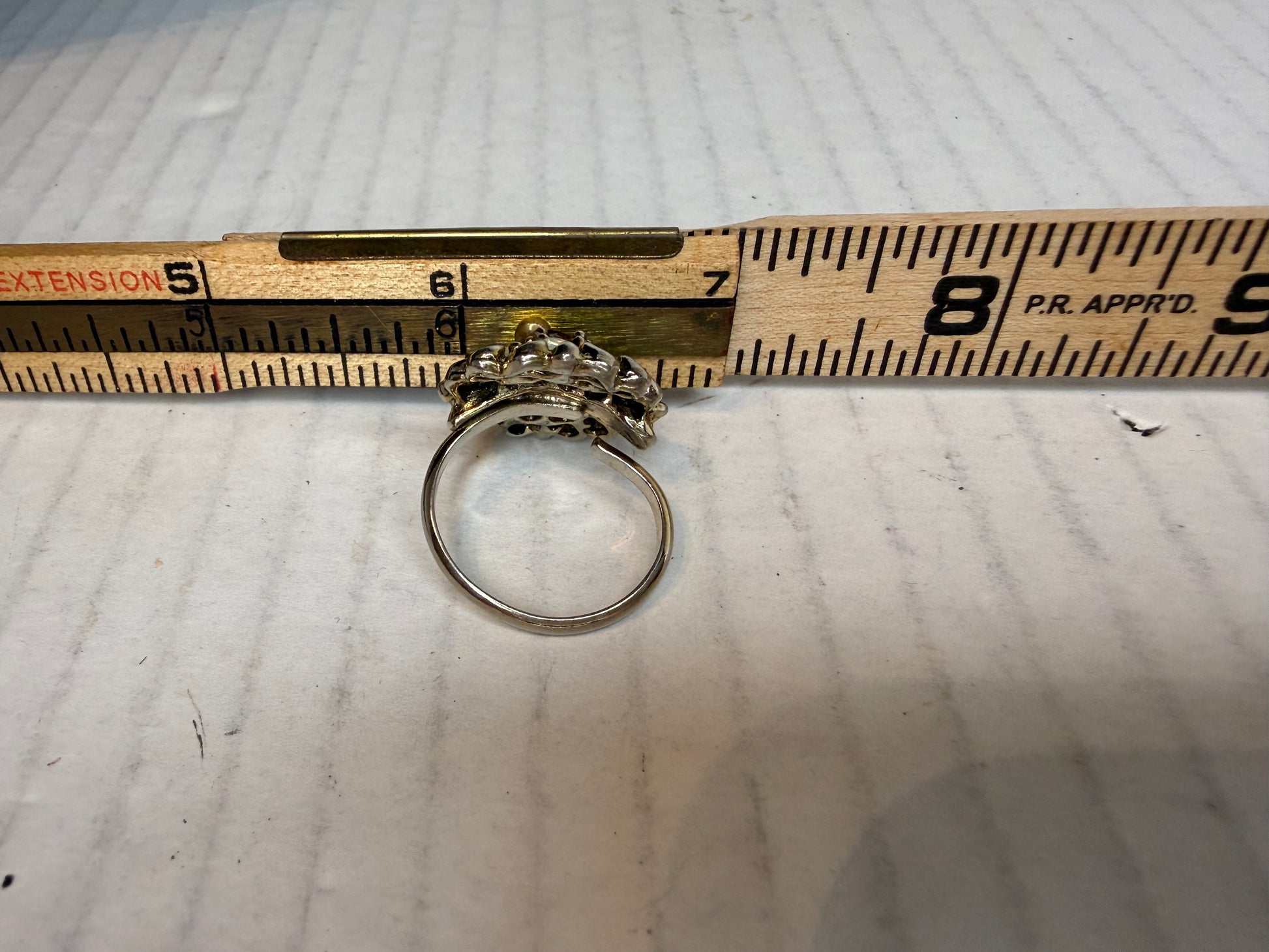No Mark. Oval shaped filigree ring with white and purple rhinestones. Adjustable. Missing 2 stones, very little wear (see pictures). Used in great condition. Shipping may be different than at check-out. Please see our shipping policies.