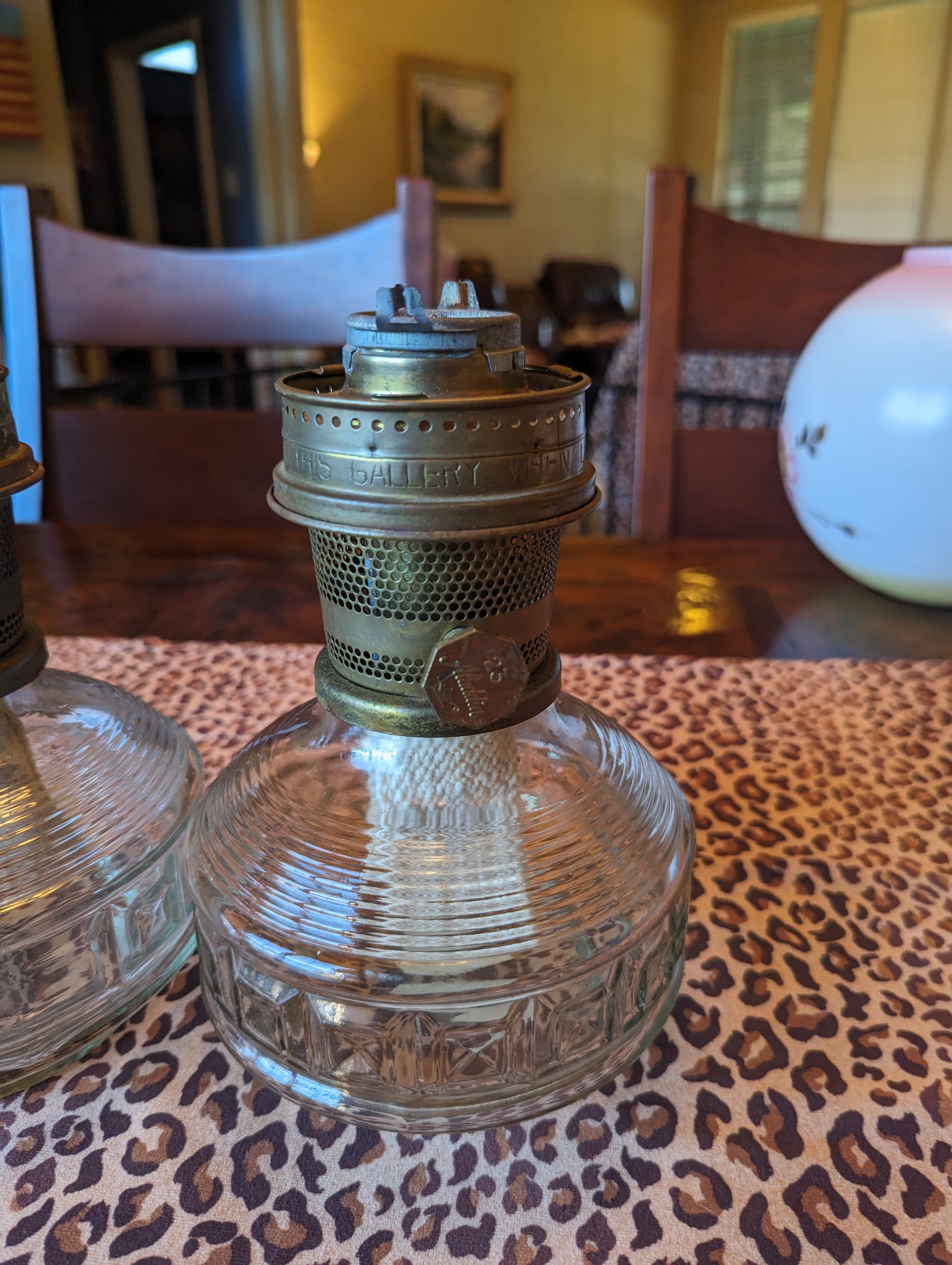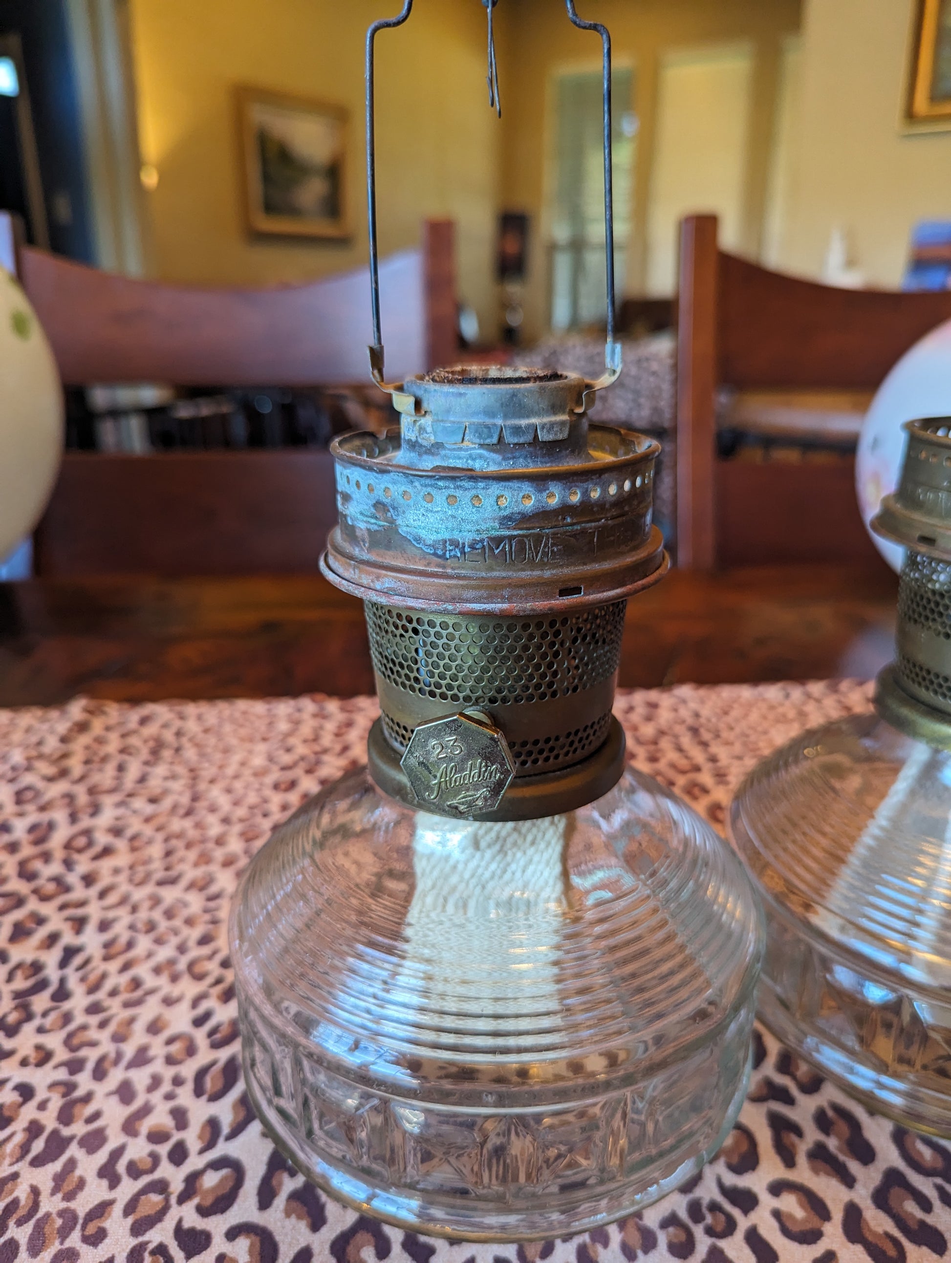 Mark: Star, Reg. TM Aladdin Manufactured Under US Patent 10 3551088. Nashville TN. Aladdin Model 23 Genie (aka Colonial), 1977-1988. Colonial Squares Panel Font Burner. Kerosene Lamp clear glass with burner. Both knobs raise and lower burner. Missing parts. Used in great condition. Shipping may be different than at check-out. Please see our shipping policies.